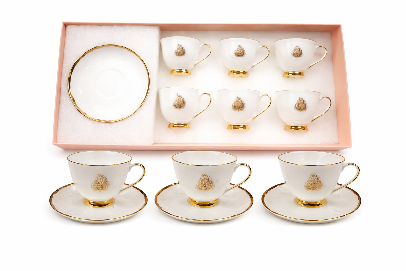 Elegant porcelain tea set with premium gold VER print finish, ideal for gifting and special occasions.