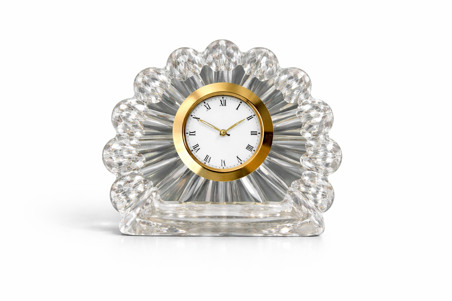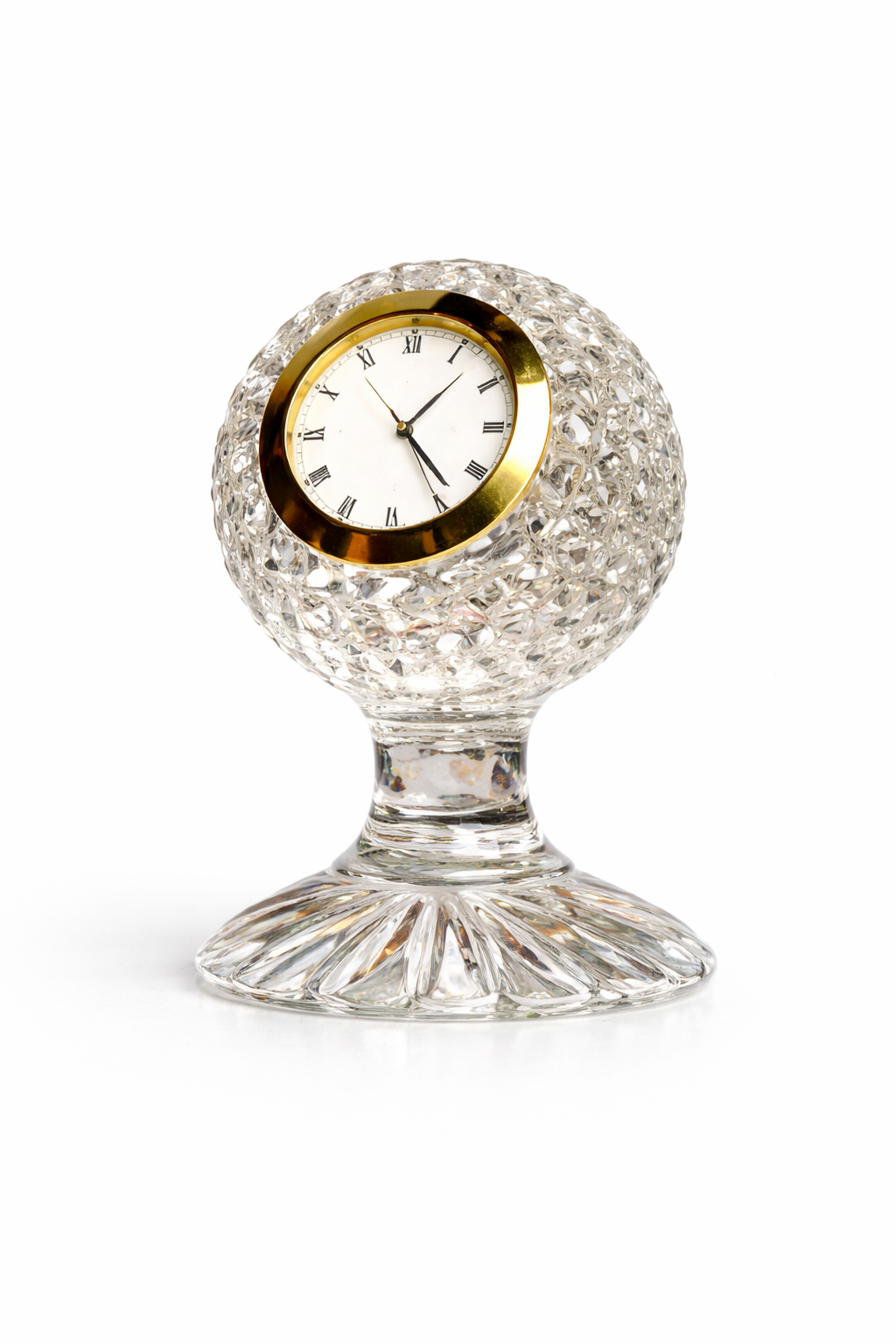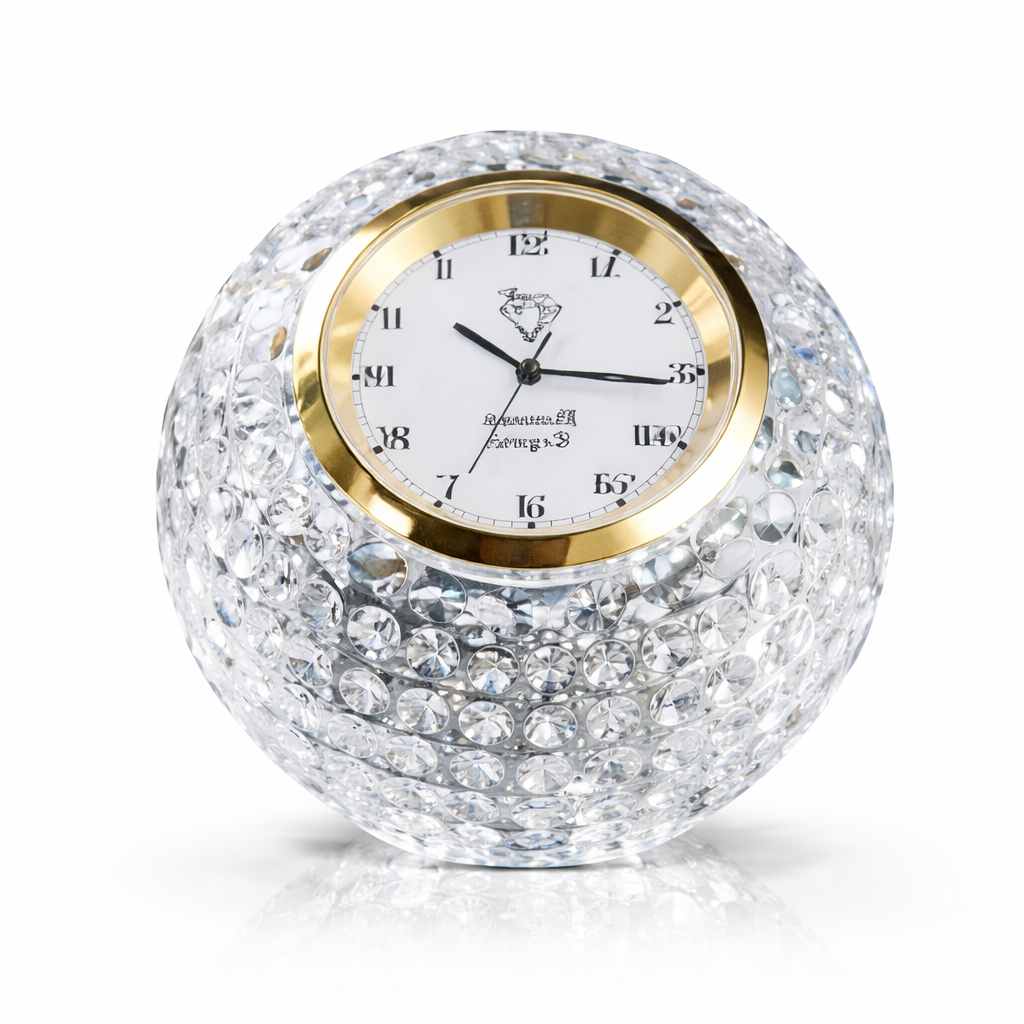 Handcrafted crystal table clock featuring a precision-cut spherical design with a classic Roman numeral dial and elegant gold-tone bezel.