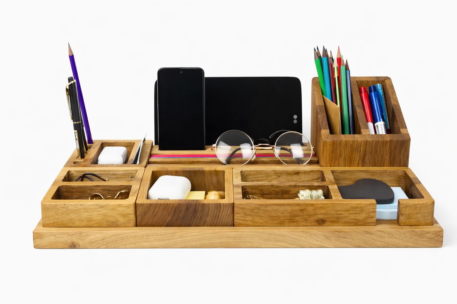 Premium Wooden Desk Organizer with Mobile Stand, Pen Holder & Accessory Trays
