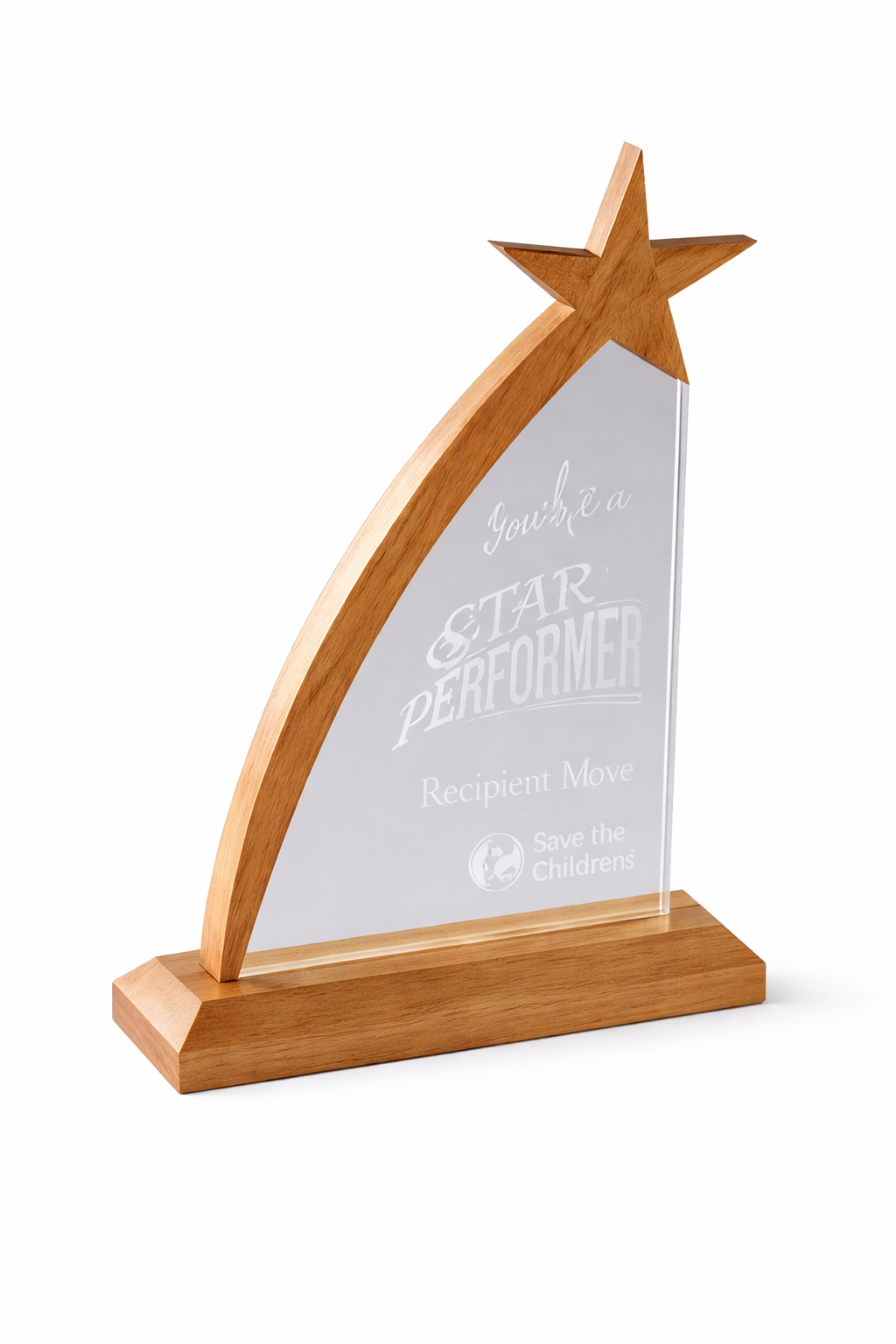 Celebrate excellence and recognize outstanding achievements with this Trophy. Featuring a sleek curved glass panel crowned with a wooden star, this award perfectly represents success, dedication, and top performance.